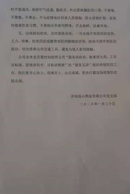 2020年春節(jié)假期以來,面對日益嚴峻的新型冠狀病毒感染的肺炎疫情防控形勢,濟南連心物業(yè)有限公司黨支部書記、董事長王宏勇要求公司廣大黨員在防控新型冠狀病毒感染肺炎疫情面前,積極發(fā)揮先鋒模范作用,為堅決打贏疫情防控阻擊戰(zhàn)提供堅強的組織保障。