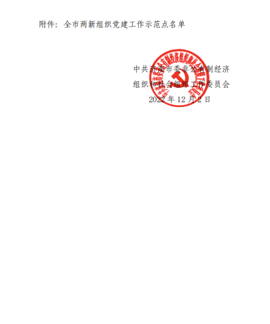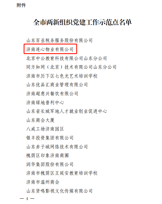 近日,中共濟南市委非公有制經(jīng)濟組織和社會組織工作委員會公布了“關于命名市級兩新組織黨建工作示范點的通知”,濟南連心物業(yè)有限公司被確定為“市級兩新組織黨建工作示范點”。